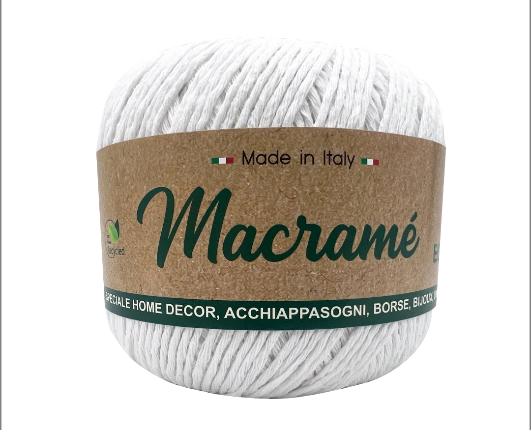 Il cordoncino Macrame Barbante è un filato green sostenibile 80%cotone 20%poliestere, 100%riciclato, spessore 2 mm, gomitoli da 150 grammi 200mt. certificata oeko-tex®, prodotto interamente in italia a biella, ferri uncinetto 3-4mm, Il cordoncino non si attorciglia ed è possibile tagliarlo a qualsiasi lunghezza. Ottimo per home decor, decorazioni da parete, acchiappasogni, borse, tende, bijoux,uncinetto e maglia